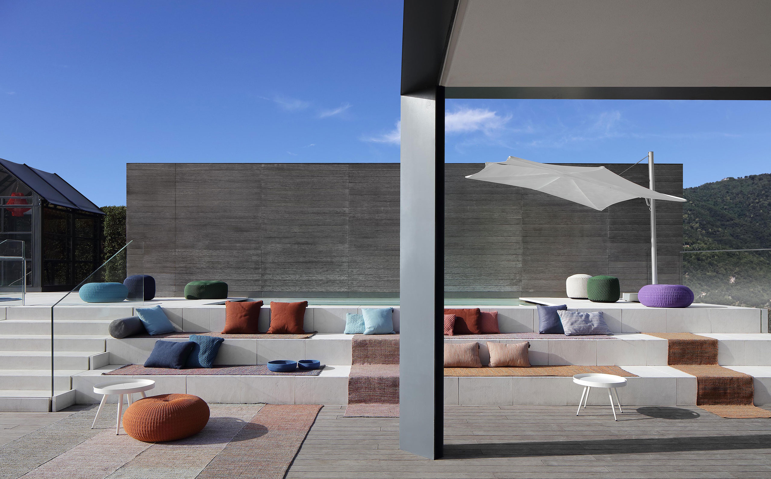 NodoItalia ropes and fabrics are UV-resistant, but prolonged exposure to intense sunlight can still affect color and strength over time. To extend their durability, we recommend using shade or protective covers when not in use. During wet weather, rain can carry dirt and pollutants that accelerate wear. Cushions and textiles should be covered or stored in dry, ventilated spaces—especially during the off-season. Always avoid plastic wraps, which can trap moisture and lead to mildew.