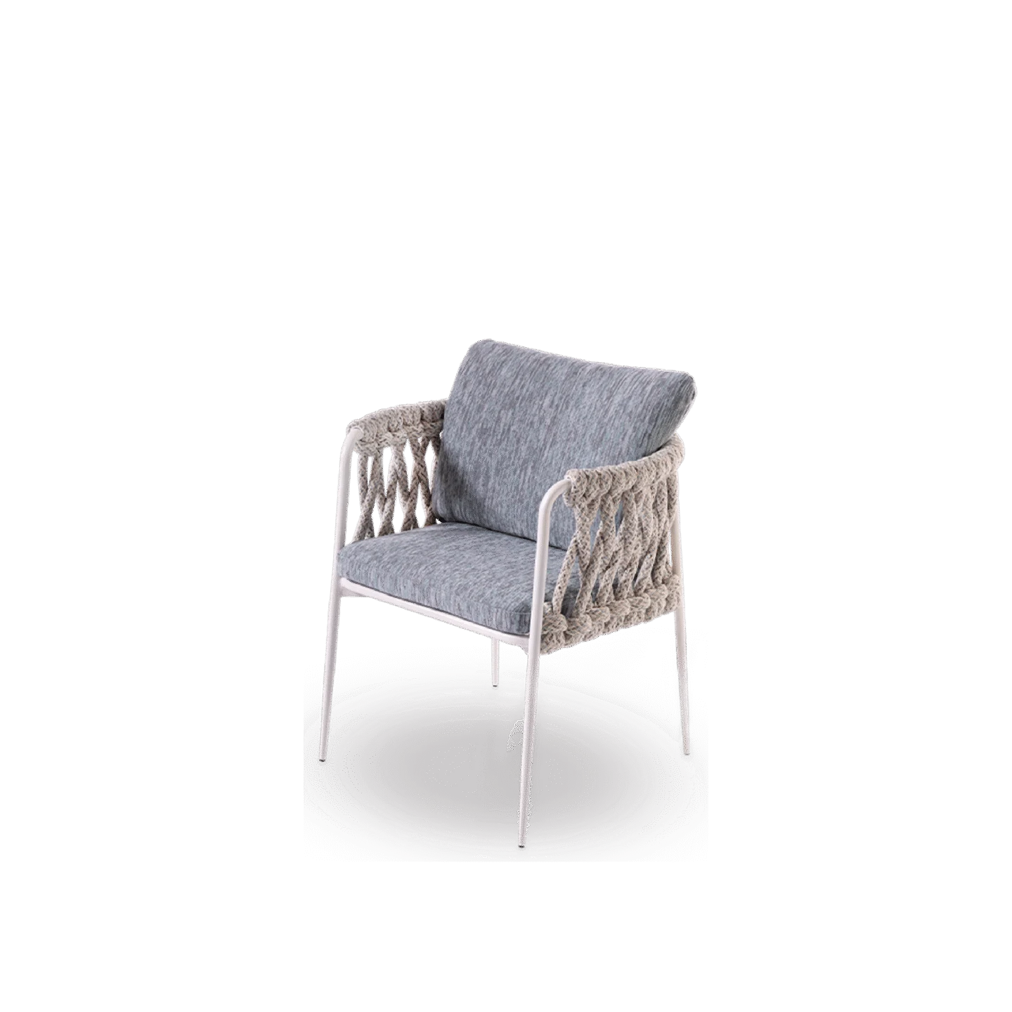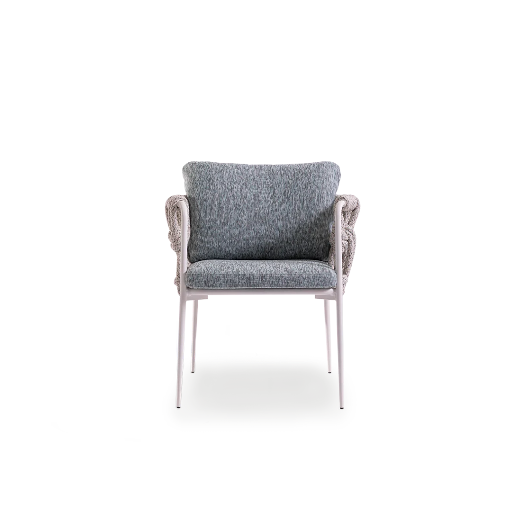 Dining chair crafted with a sturdy aluminium frame, wrapped in hand-woven Olyna® for a refined, artisanal character. The seat and back cushions feature water-resistant padding and removable covers in exclusive NodoItalia fabrics. Elastic straps beneath the seat provide enhanced comfort and flexible support. Designed for elegant and relaxed outdoor dining.