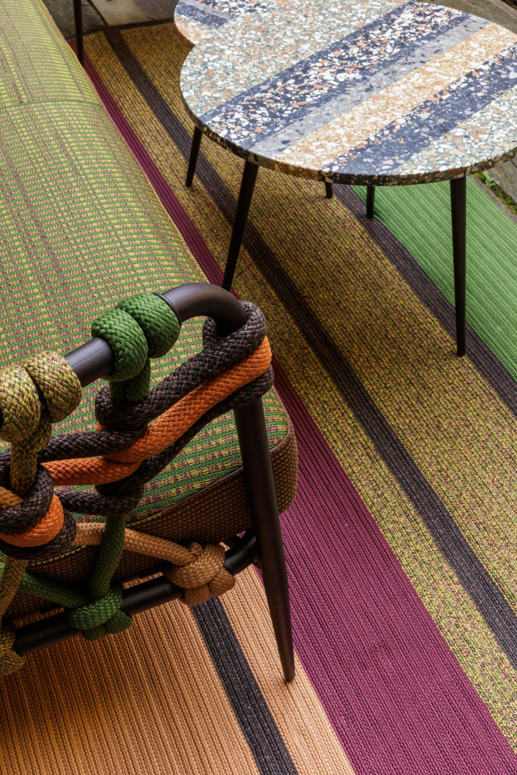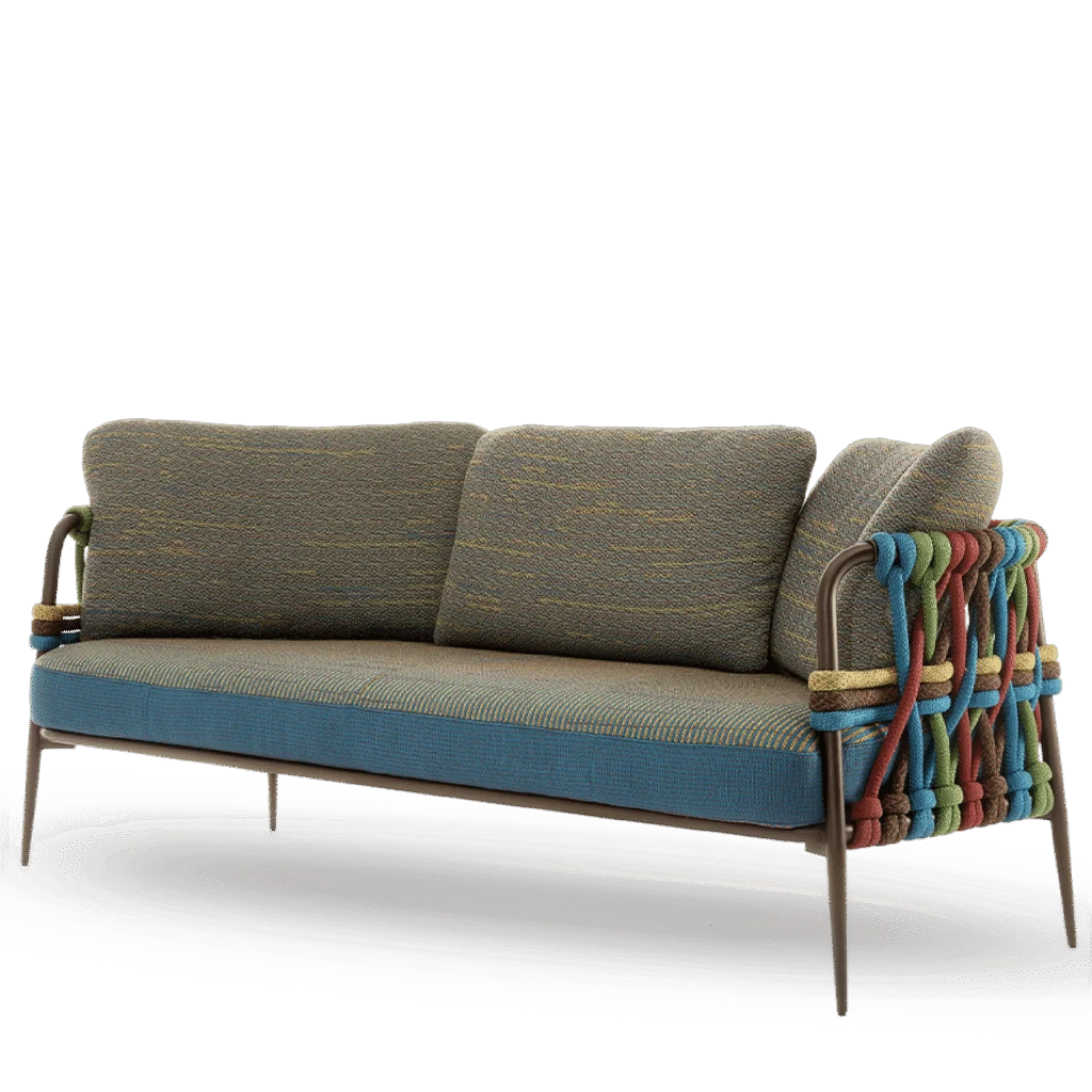 NodoItalia ropes and fabrics are UV-resistant, but prolonged exposure to intense sunlight can still affect color and strength over time. To extend their durability, we recommend using shade or protective covers when not in use. During wet weather, rain can carry dirt and pollutants that accelerate wear. Cushions and textiles should be covered or stored in dry, ventilated spaces—especially during the off-season. Always avoid plastic wraps, which can trap moisture and lead to mildew.